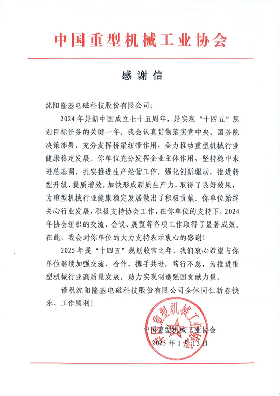 近日,沈陽隆基收到中國重型機械工業協會發來的感謝信。
