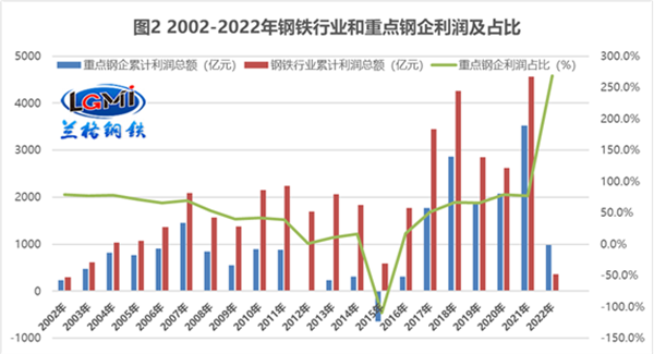 其一,從粗鋼產量數據來看,2022年全國粗鋼產量10.13億噸,其中重點鋼企粗鋼產量8.15億噸,占總產量的80.5%(詳見圖1)。從營收數據來看,2022年鋼鐵行業實現營業收入87147億元,其中重點鋼企實現營業收入65875億元,占總營收的75.6%。從銷售利潤率數據來看,2022年鋼鐵行業全年的銷售利潤率僅僅為0.4%,而重點鋼企的銷售利潤率為1.5%,高出整體行業1.1個百分點。從利潤數據來看,2022年鋼鐵行業實現利潤總額365.5億元,其中重點鋼企實現利潤總額982億元,重點鋼企的利潤總額竟然高出整體行業如此之多(詳見圖2),而作為鋼企龍頭的中國寶武去年實現利潤總額312.8億元,占重點鋼企利潤的31.8%;而暫居鋼鐵行業利潤榜第二位的湖南鋼鐵集團實現利潤總額150.3億元,占重點鋼企利潤的15.3%;中國寶武和湖南鋼鐵集團總計的利潤占比達到了47.1%,近半壁江山,這表明國內鋼鐵行業兼并重組的效應正在深度發酵著,八成的產量實現了七成的營收更實現了鋼企利潤的明顯提升。