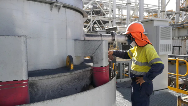 年后,中國大多數地方還是寒風瑟瑟,甚至冰雪千里,地球另一端的澳大利亞確是陽光燦爛的炎炎盛夏,項目所在地的溫度更是高達40度,加上設備調試點距地面有十層樓的高度,穿著長袖工裝,帶著面罩的隆基工程師必須頂著高溫每隔2小時爬樓調試一次,工作難度可想而知。