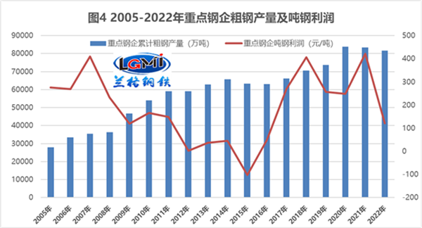 其二,從噸鋼利潤數據來看,2022年整體鋼鐵行業噸鋼利潤呈現快速下降的態勢,全年的噸鋼利潤僅在五十元左右(詳見圖3),而重點鋼企的的噸鋼利潤可以達到百元左右(詳見圖4),這表明在鋼材市場大幅波動的環境中,大中型鋼鐵生產企業的抗風險能力明顯增強,同時也表明了這幾年鋼企針對下游需求變化而進行的產品結構調整正在發揮著有效作用。